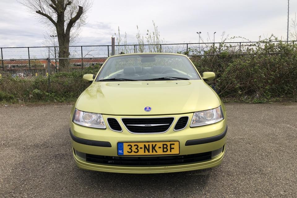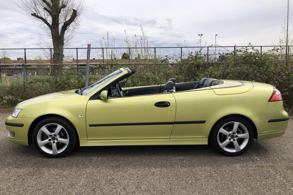 Een SAAB Cabriolet in de introductiekleur Lime Yellow. een unieke Nederlandse auto dealer onderhouden en recent van een nieuw dak voorzien.